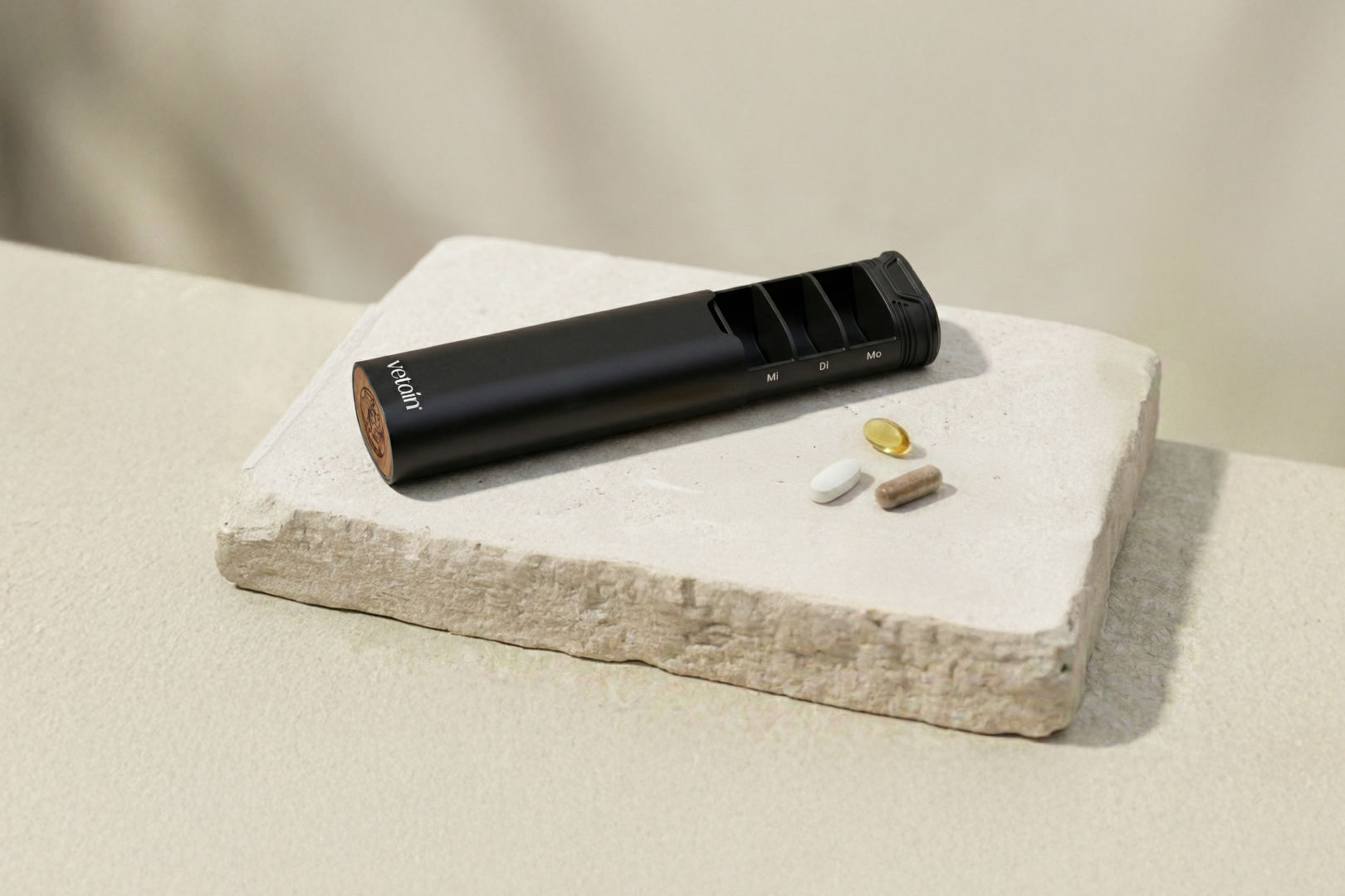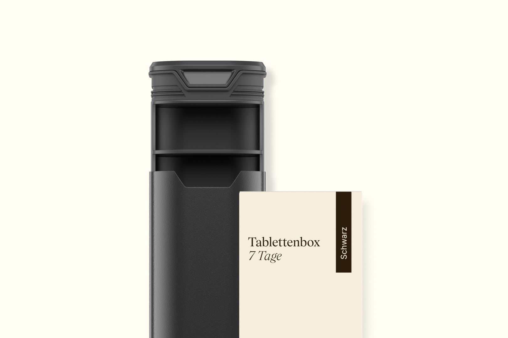 Schwarze Tablettenbox von Vetain. Sicher & clean. Deine täglichen Supplements, perfekt verpackt; Perfekt vorbereitet - unterwegs und Zuhause, klare Wochenstruktur, Dezentes Vetain Branding