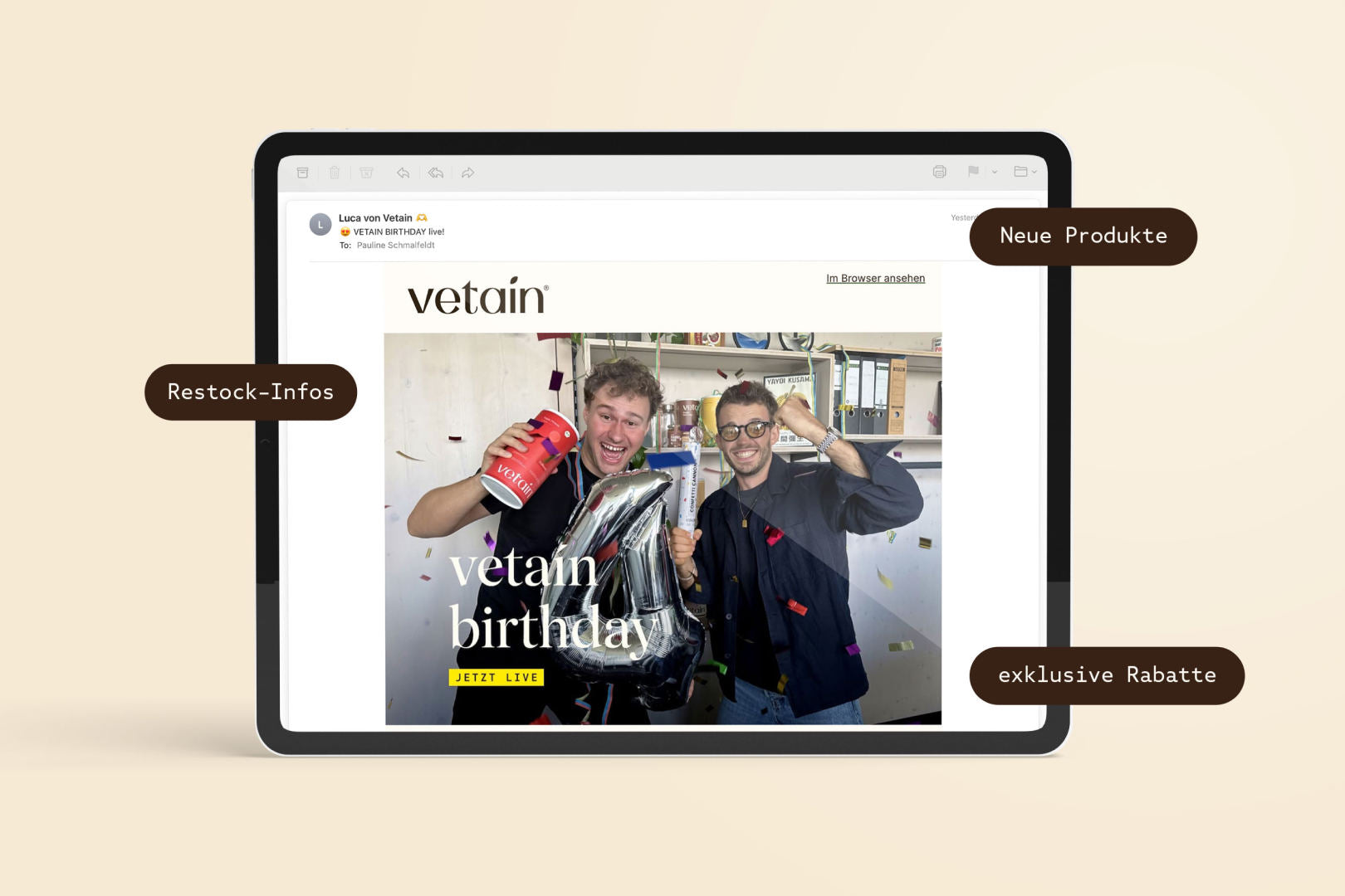 Mit unserem Vetain-Newsletter verpasst du nichts mehr: exklusive Rabattcodes, neue Produkte, spannende Aktionen und ein Blick hinter die Kulissen.
